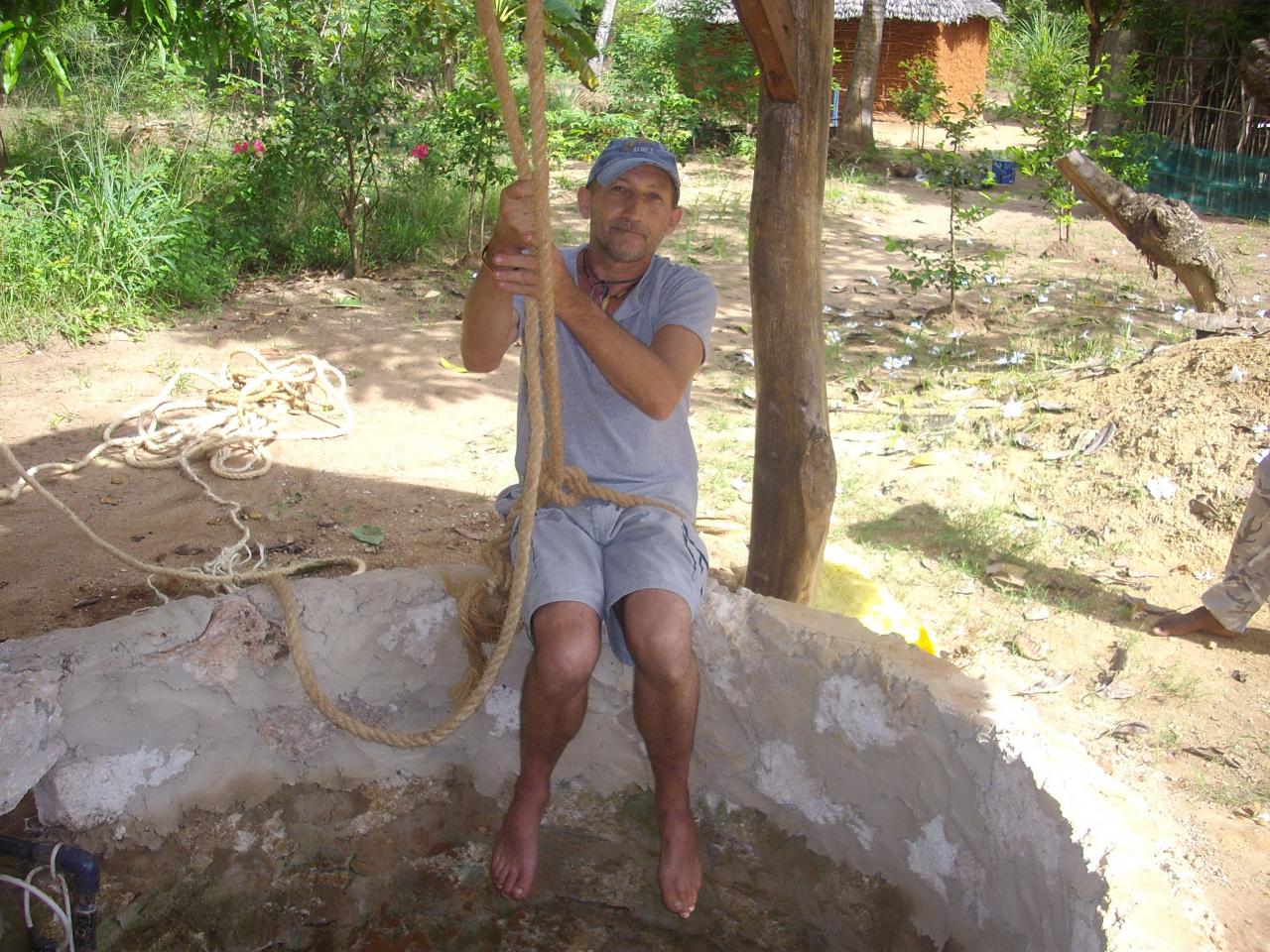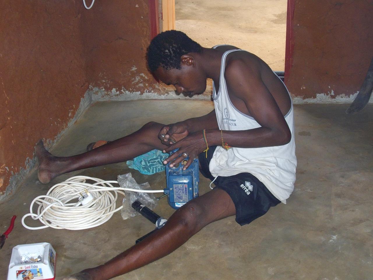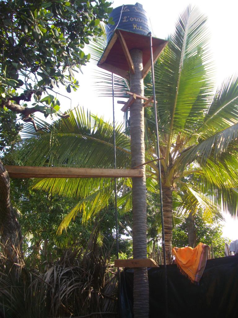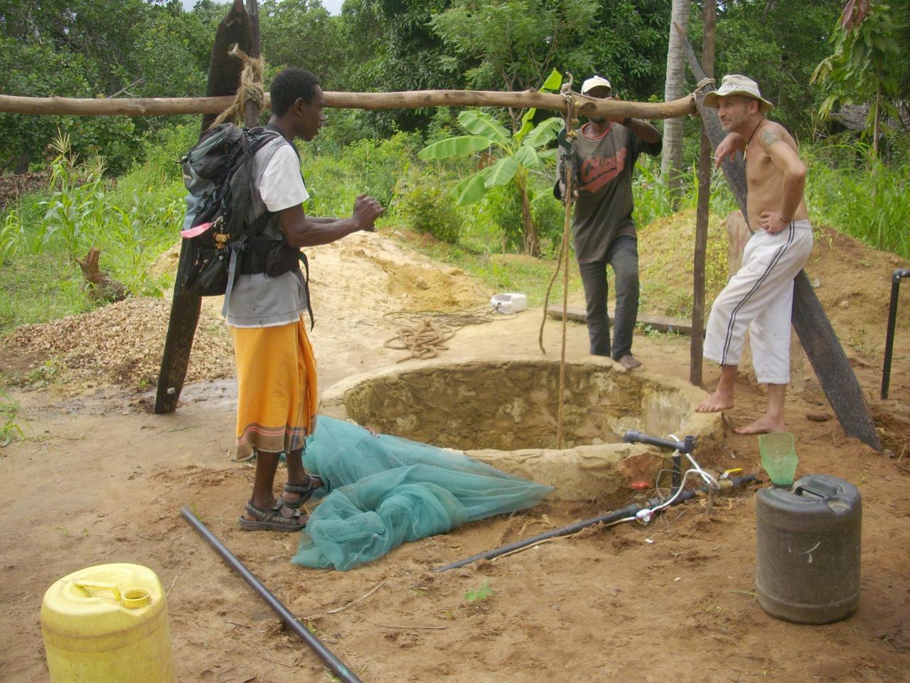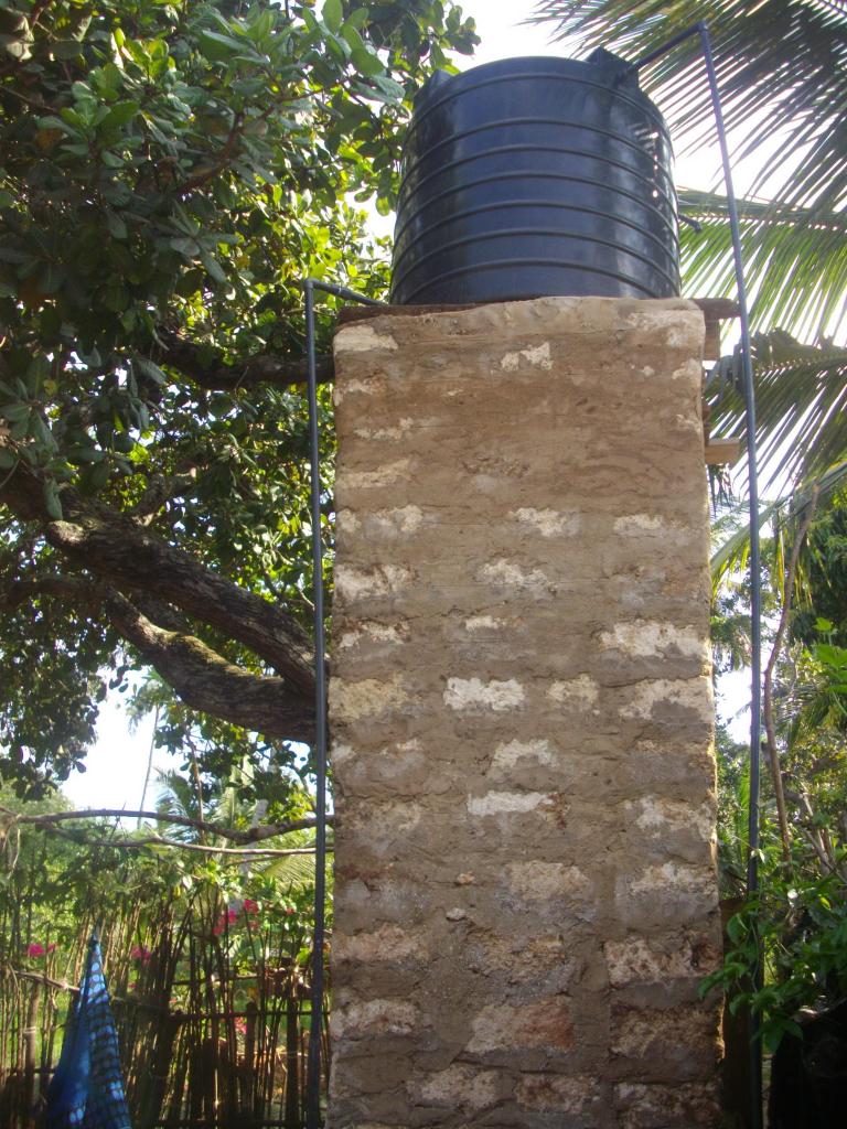 Avec des températures pouvant exploser à 50°c en période sèche, hors de question de courrir chercher de l'eau si on veut que la terre soit productrice et productive. Alors après le creusement d'un puits sur site, nous avons du construire un château d'eau avec les moyens trouvés sur place, en offrant parrallèlement une formation aux métiers des jeunes des alentours.
