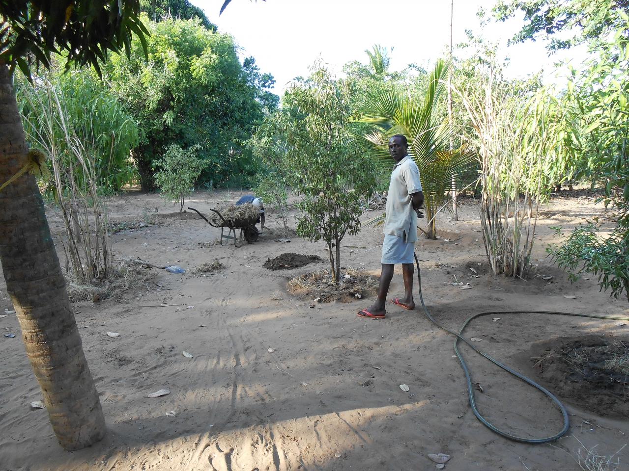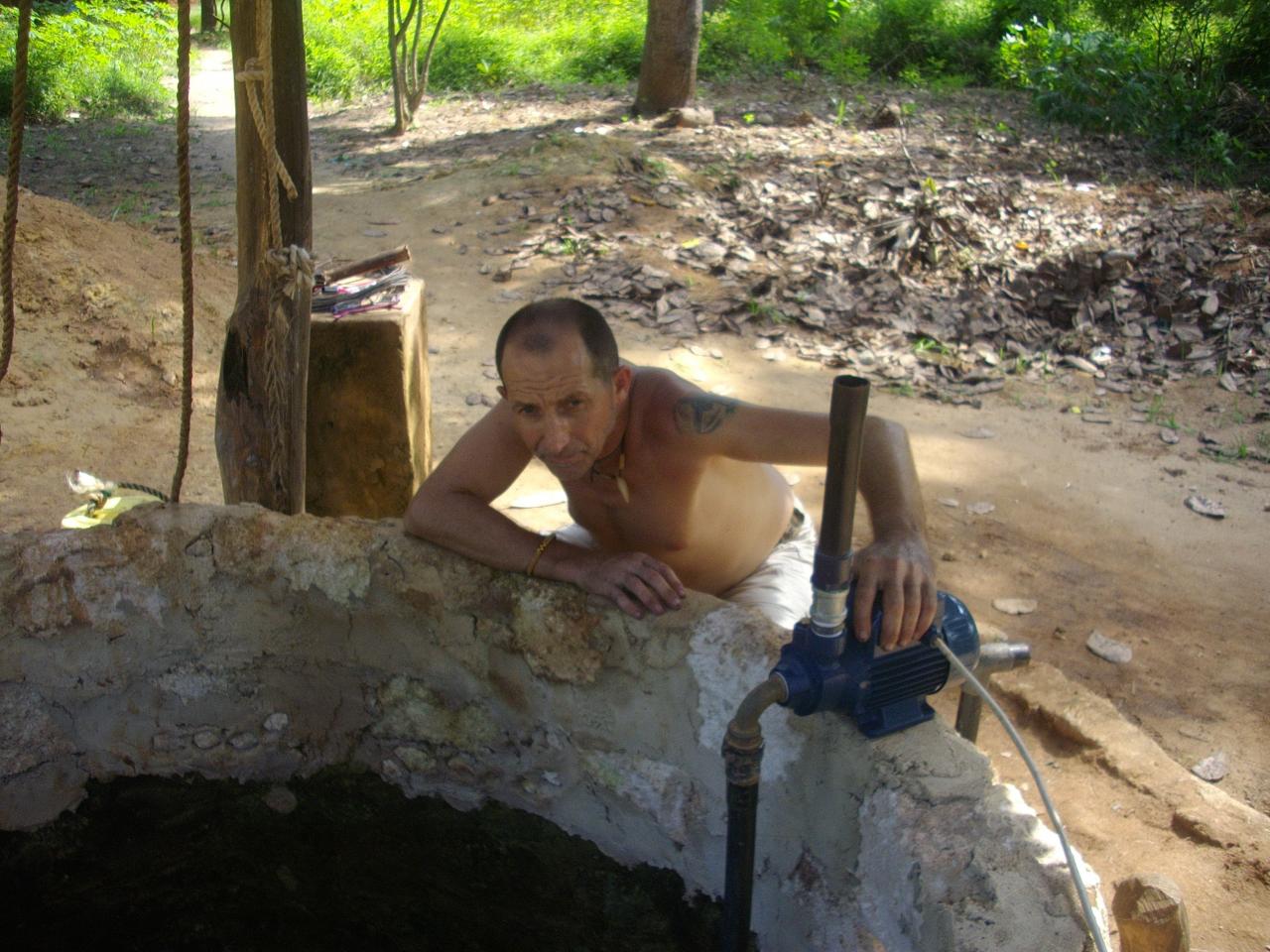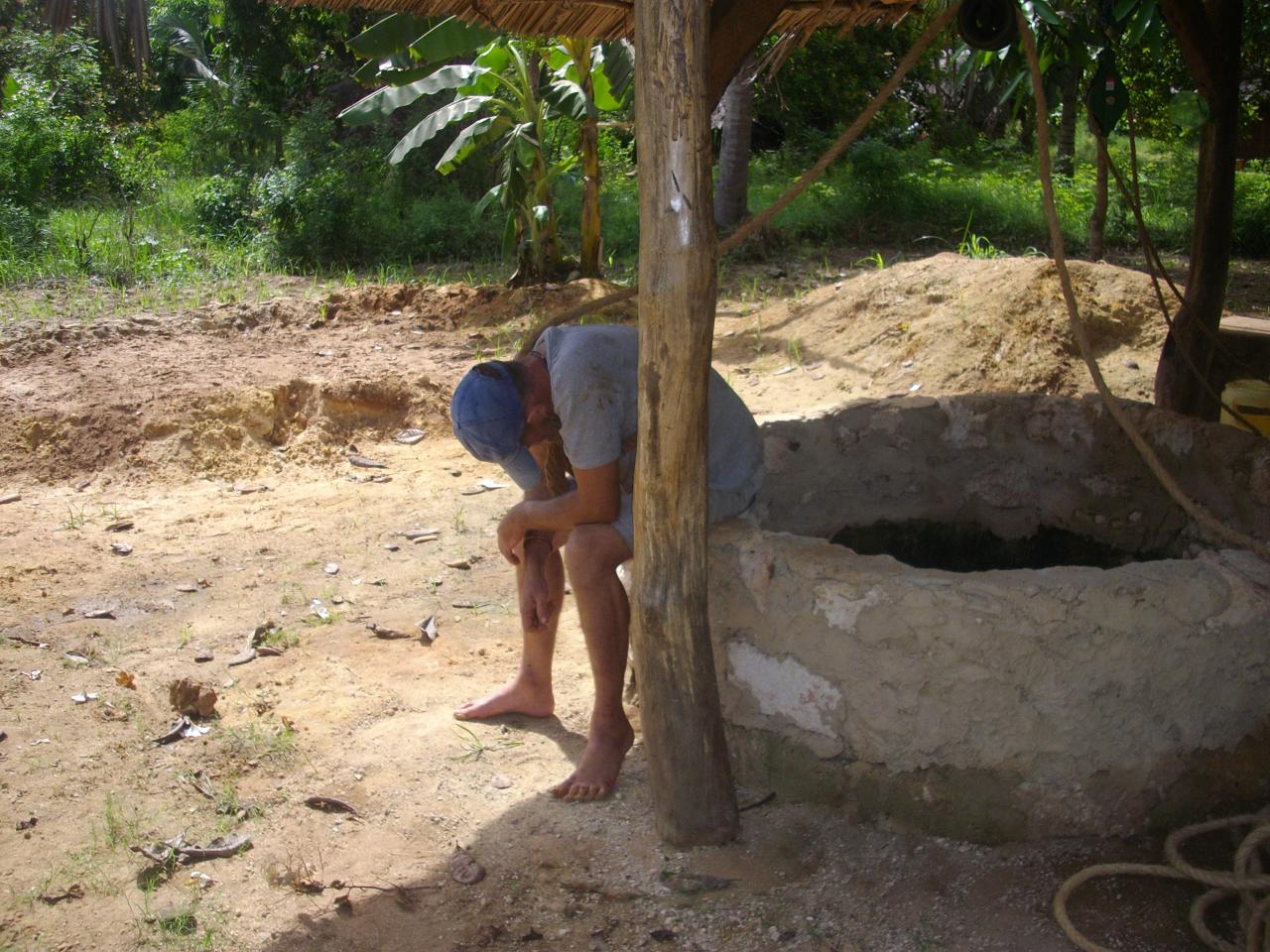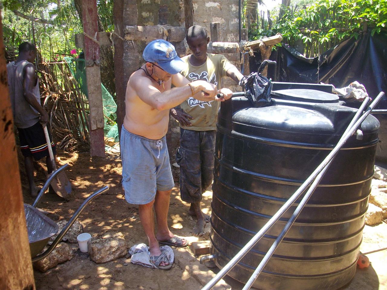 Avec des températures pouvant exploser à 50°c en période sèche, hors de question de courrir chercher de l'eau si on veut que la terre soit productrice et productive. Alors après le creusement d'un puits sur site, nous avons du construire un château d'eau avec les moyens trouvés sur place, en offrant parrallèlement une formation aux métiers des jeunes des alentours.