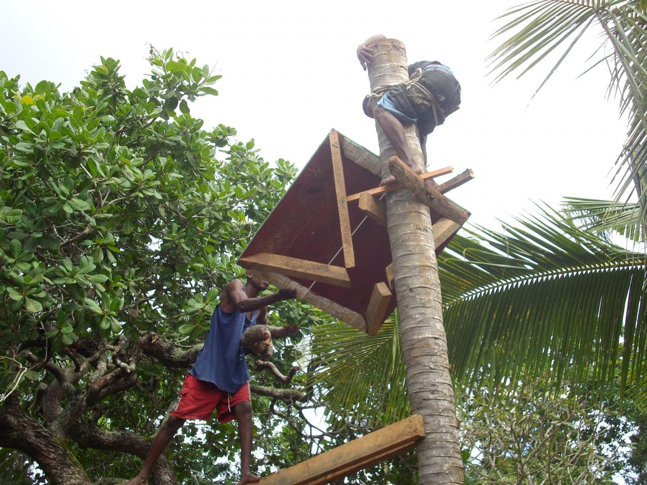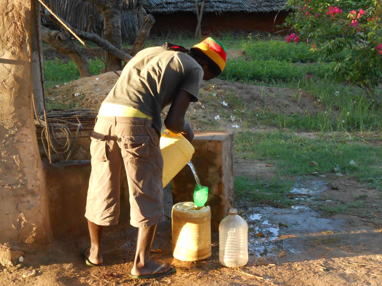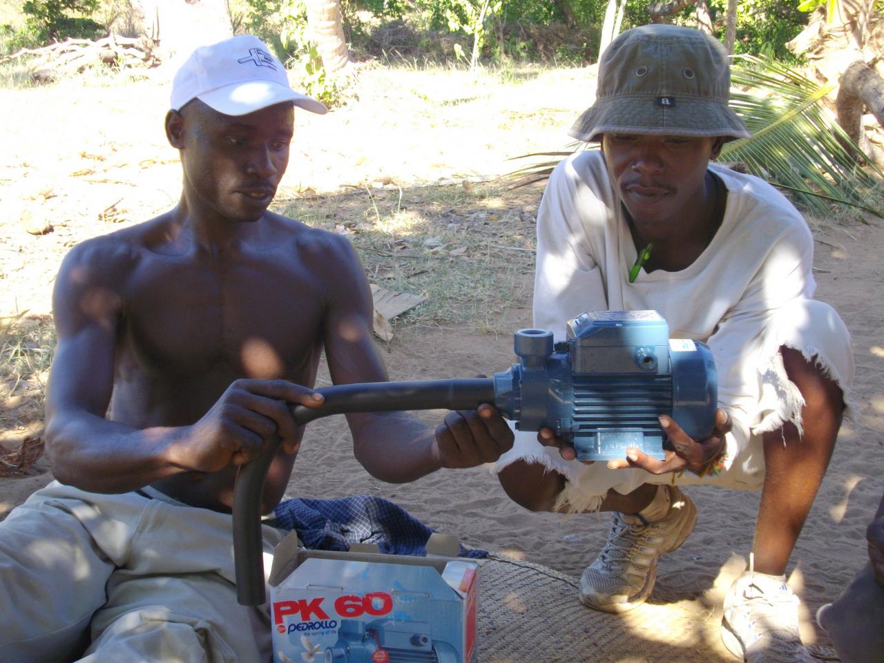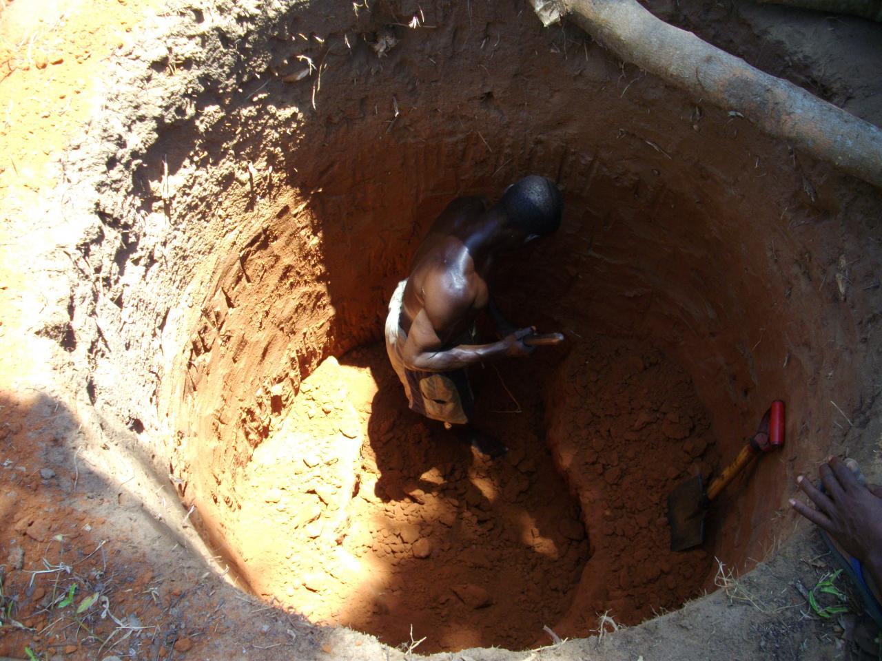 Avec des températures pouvant exploser à 50°c en période sèche, hors de question de courrir chercher de l'eau si on veut que la terre soit productrice et productive. Alors après le creusement d'un puits sur site, nous avons du construire un château d'eau avec les moyens trouvés sur place, en offrant parrallèlement une formation aux métiers des jeunes des alentours.